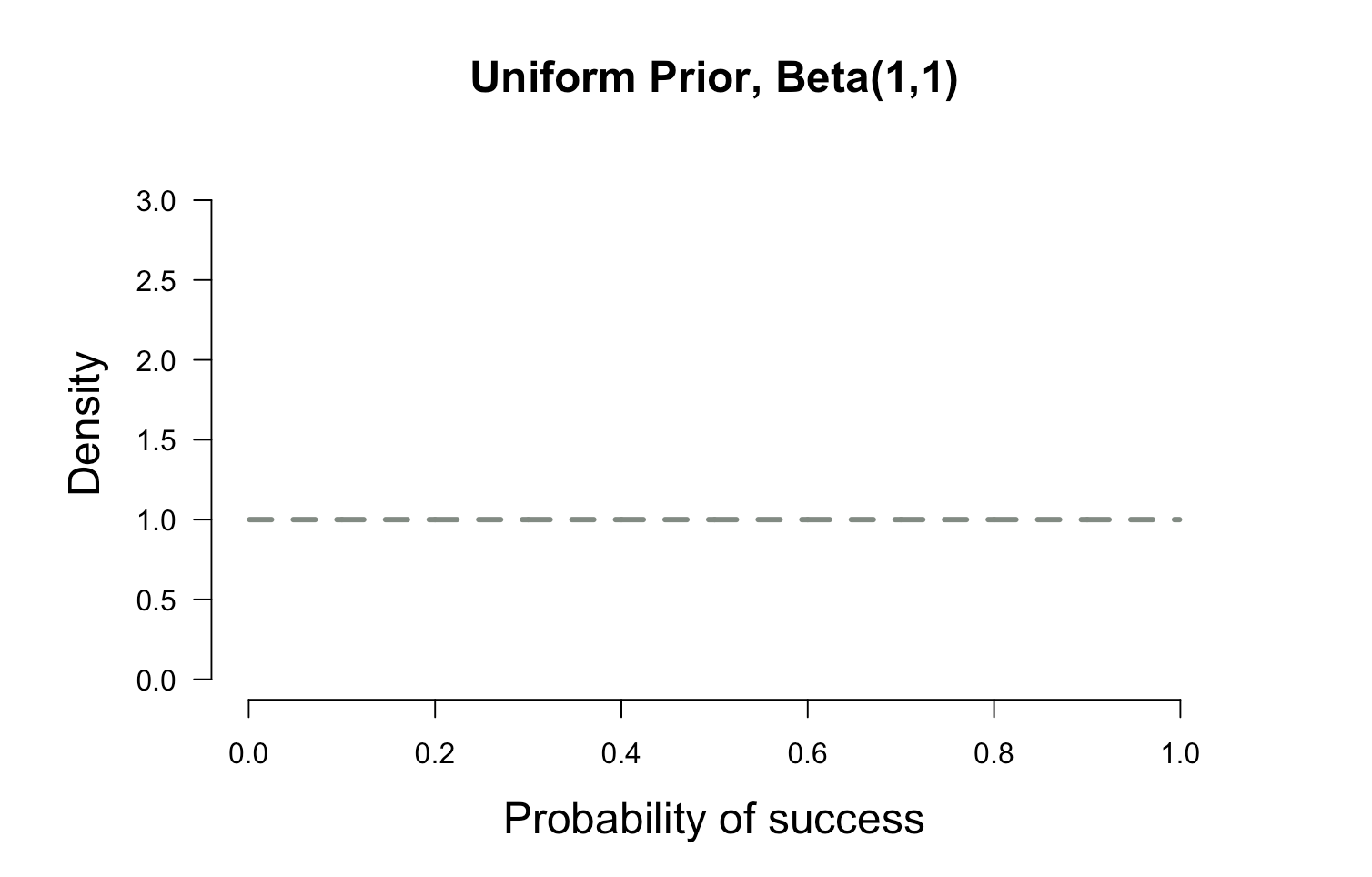 plot.beta(1,1,ymax=3.2,main="Uniform Prior, Beta(1,1)")
