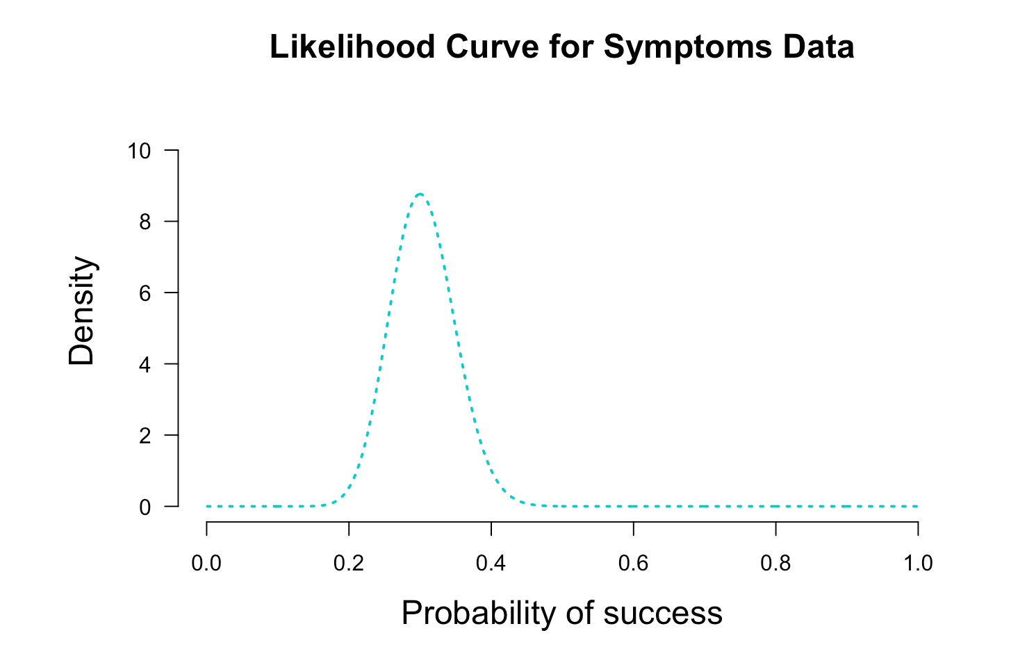 xlab= "Probability of success", las=1, main="Likelihood Curve for Symptoms Data",lwd=2,