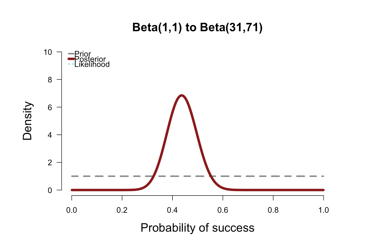 With the uniform prior, the posterior falls right on top of the likelihood function. In the plot above, the likelihood is nearly invisible because the posterior sits right on top of it. When the prior has only 1 or 2 data points worth of information, it has essentially no impact on the posterior shape