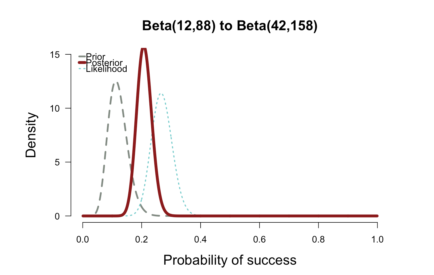 plot.beta(12,88,42,158,ymax=15,main="Beta(12,88) to Beta(42,158)")