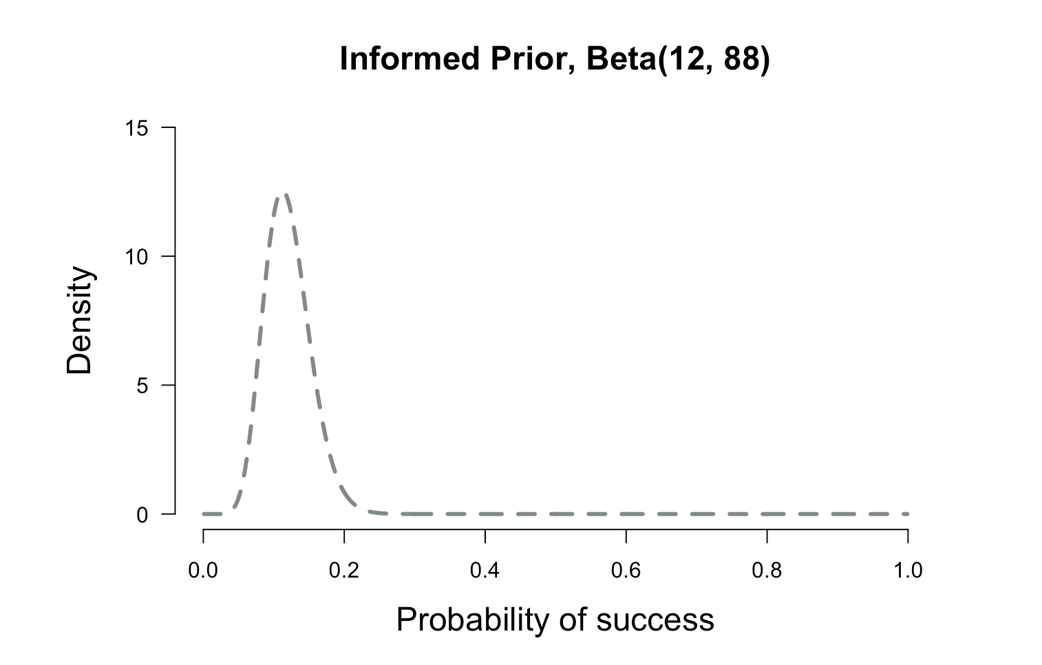 plot.beta(12,88,ymax=15,main="Informed Prior, Beta(12, 88)")